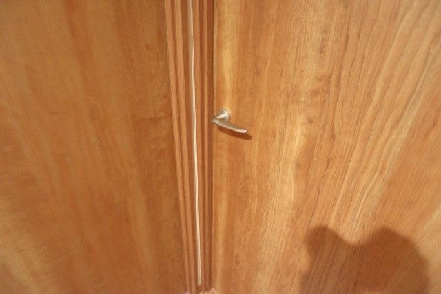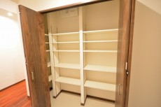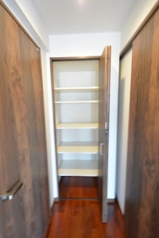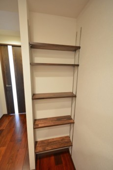 ドアを閉めるとあらわれるのが、収納棚です。ここも奥行きたっぷりなので、いろいろ仕舞えてお部屋がスッキリです♪