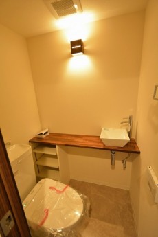 広々スペースに、可愛らしい木目調の洗面台、間接照明と、落ち着いた空間なので、トイレタイムが長くなりそう(笑)^_^;