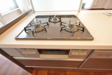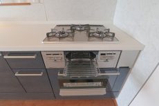 コンロは3口のグリル付きガスコンロです。グリルを使えば肉も魚もこんがりふっくら約ことが出来るので毎日のお料理も楽しくなりそうですね。