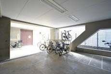 エントランスアプローチから建物脇へ進むとエントランス、その奥に駐車場や駐輪場、ゴミ置き場もこちらにあります。