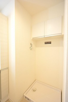 ランドリースペースの上部には洗剤などのストックに重宝する吊戸棚が設置されています。