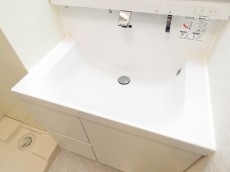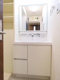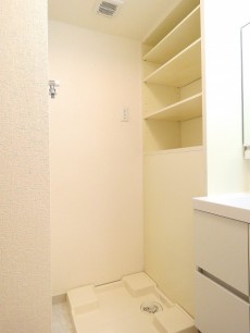 廊下をあがってすぐ左側は洗面室。洗濯機置場、洗面化粧台、バスルームがまとまっています。玄関から近いと帰宅後の手洗い・うがいもスムーズにできますね。
