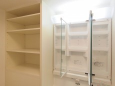 洗面化粧台の鏡の裏、引き出し、洗濯機置場の壁面の棚と洗面室内は収納箇所が豊富。ゴチャゴチャ散らかりがちな水廻りもスッキリ片付けておけそうです。