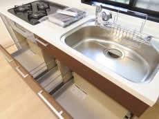 キッチンは浄水機能付き水栓、3口コンロ、人造大理石トップ、収納たっぷりとスペック◎!正面に窓を開ければお料理中の匂いや熱もスムーズに解消できそうです。冷蔵庫はキッチン向かって右側におけるようになっています。