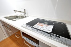 設備は3口IHキッチンに浄水器一体型水栓が付いています。