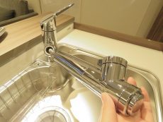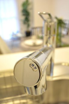 キッチンの水栓は浄水機能付きシャワー水栓。ワンタッチで浄水に切り替え可能です。