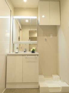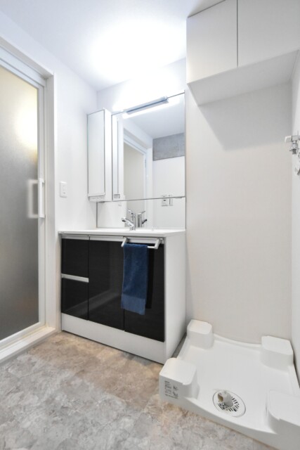 洗面化粧台、洗濯機置場はお隣同士。白基調で清潔感がありますね♡