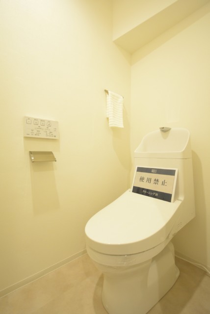 温水暖房便座付。吊戸棚もあります。吊戸棚はトイレットペーパーなどのストックが十分に入る大きさです。
