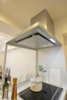 レンジフードは薄型で、圧迫感なくキッチンに馴染んでいます。