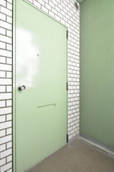 ご紹介するお部屋の玄関前にきました。サブウェイタイル風のタイルが貼られた外壁に、淡いグリーンの扉が映えます。
