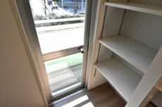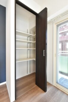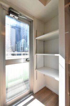 キッチン奥にはバルコニーへの出入り口があります。その手前は冷蔵庫置場とパントリースペースとなっております。パントリースペースには可動棚が付いていました。食品のストックやゴミ箱を置いておけるこのようなスペースがあるのは嬉しい限りです。