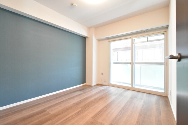 先ほど入ってきた引き戸を閉めるとこんな感じです。一部アクセントクロスが貼られた壁面があります。