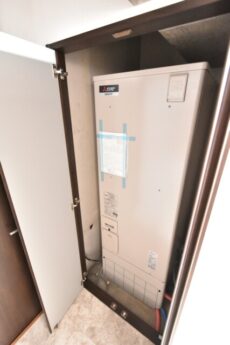 洗面室に入ってすぐ左側には電気温水器がかくれんぼ。
