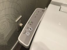 まずは、トイレ。デザインクロスが印象的な雰囲気。ウォシュレットに上部戸棚と機能もしっかり。