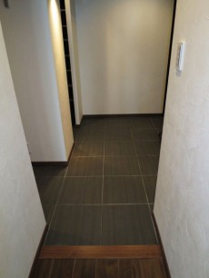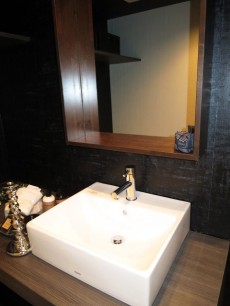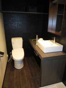 サニタリースペースはこんな感じ。ブラックのクロス&ダークブラウンの床、という