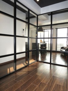 約3.5帖の洋室。壁面がガラス貼りのせいか、もっと広く感じます。天井もブラック