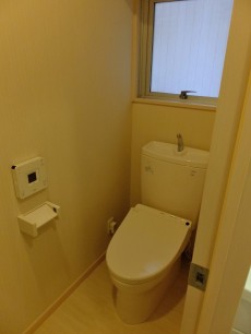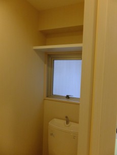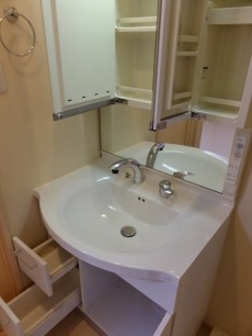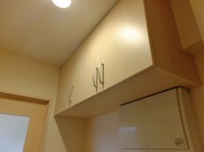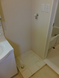 洗面台の隣りは洗濯機置場です。棚がありませんので、機能的な棚を取り付けて、スッキリ収納を目指しましょう☆
