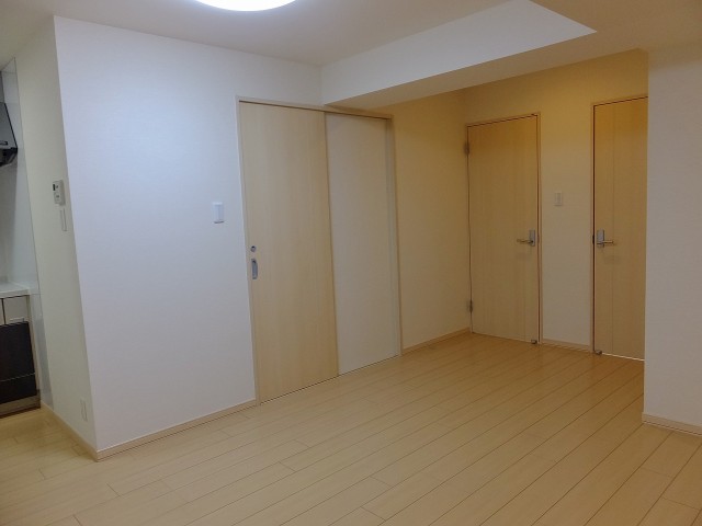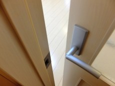 リビングに入るとドアが3つあります。手前からサニタリールームと二つの洋室です。
