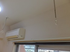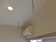 このお部屋にもエアコンが付いています!!天井からは吊皮の様な2本の棒が伸びていて。。。