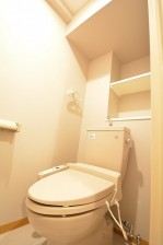 玄関から上がって右にトイレがあります。後ろに棚が用意されているので、ちょっとした備品を置いておくこともできます。