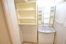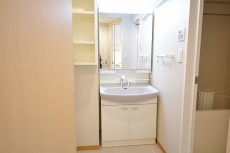 洗面台の隣に洗濯機が置けます。便利なリネン棚も完備されているので、タオル類も手の届くところに置いておけます。お部屋に取りに行く・・・なんて手間がかからなくていいですね。
