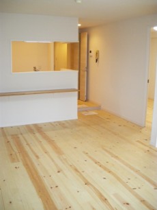 無垢パイン材のフローリングの質感が足に優しいリビングダイニング。木のいい香りが