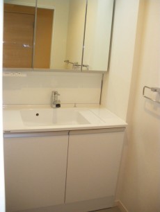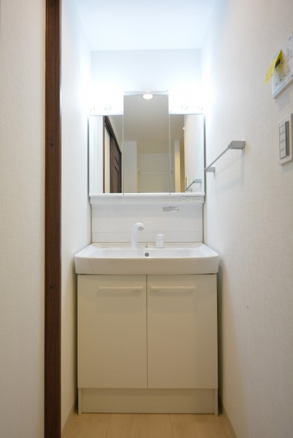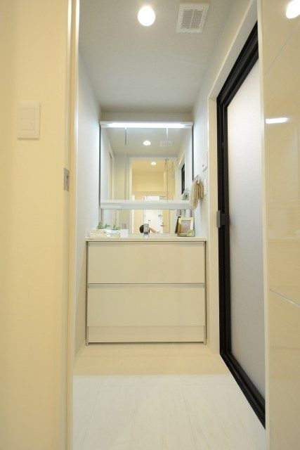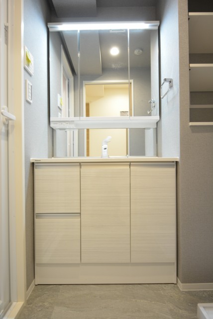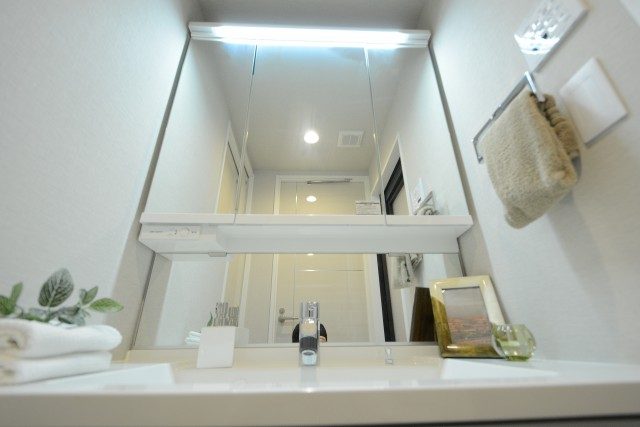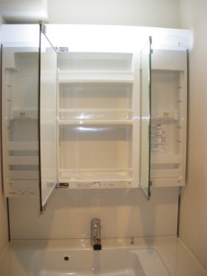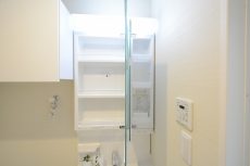 気持ちよく顔や手を洗えそうです。三面鏡の裏は全面収納になっており、ドライヤーも