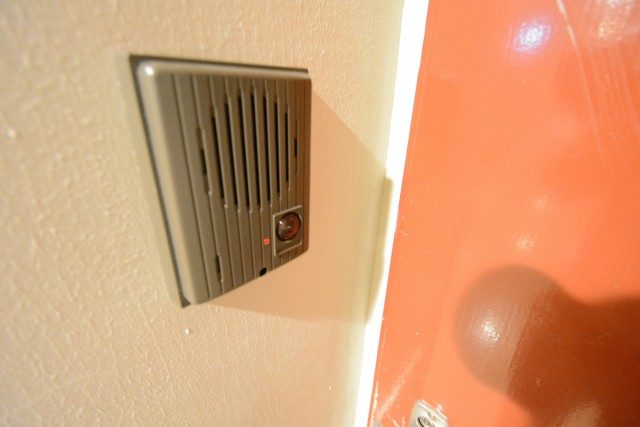 このモニターに玄関前の様子が映るんですね。お部屋の真ん中で、どこからも近い所ですよ。