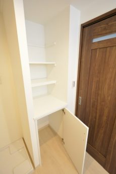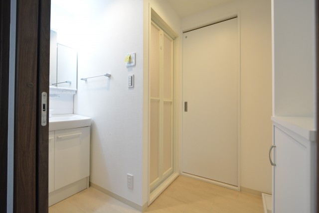 洗面台後ろには洗濯機スペースと収納がありました。収納の一番下にはランドリーバスケットなんか良さそうですね。