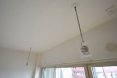 天井から下がっているのは物干し金具で、間に竿を通して使います。ちょうどエアコン取付場所の前なので、お部屋の乾燥予防にも一役買ってくれますよ。もちろん外す事も出来ますのでご安心下さい。