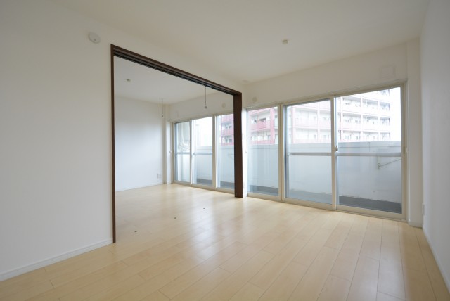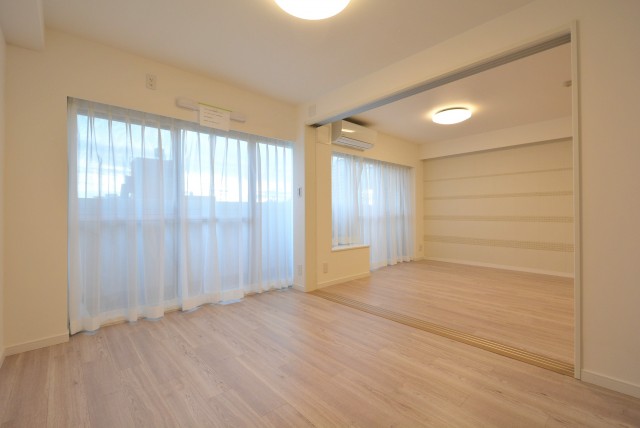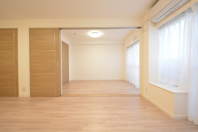 となりの約5.7帖の洋室とつなげてみました。約16.3帖のお部屋の出来上がりです。白を基調としたベーシックなお部屋で、どんな家具でも合わせられそうですね。