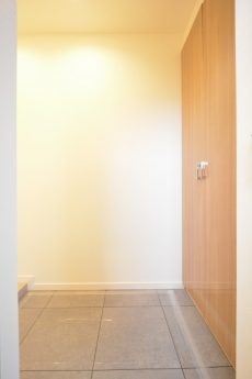 玄関にはトールタイプのシューズボックス。下部には間接照明が設置され、