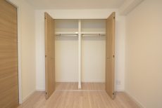 間口も奥行きもあるとても広いクローゼットですね。大きなスーツケースなども置けそうですし、床に衣装ケースを置くのも良いかもしれません。右側のクローゼットには奥に収納棚までついていますよ。
