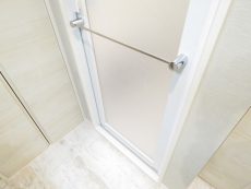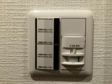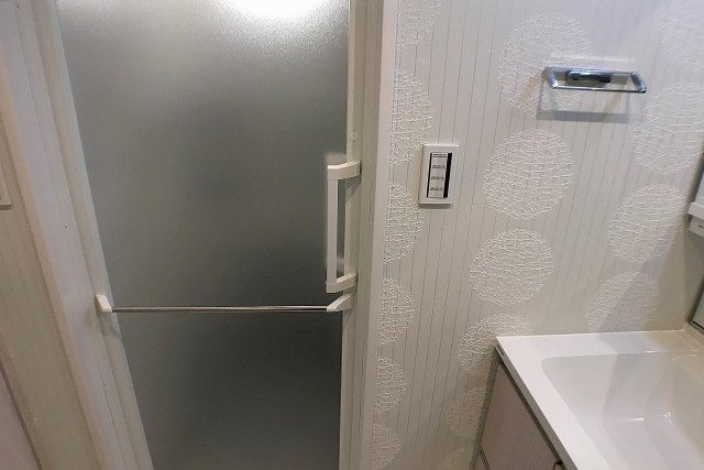 表扉にはタオル掛けが設置されており、横の壁面には浴室換気乾燥機の操作パネルがついています。