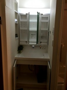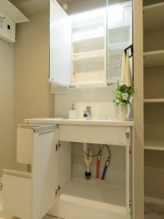 鏡の裏、引き出し等、収納スペースが豊富です。ゴチャつきがちな水廻りもすっきり片付きそうです。