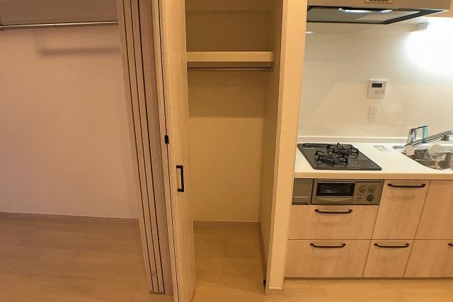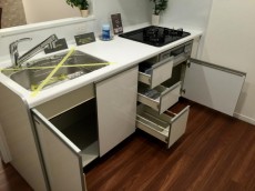 上部に収納が無いので、少し収納は少ないかもしれません。しかし、キッチンのスペースにはだいぶゆとりがありますので、お気に入りの食器棚も充分設置可能です(o´∀`ノ