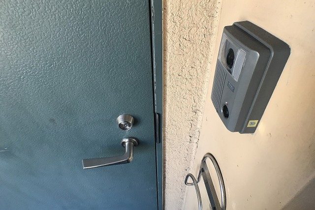こちらがマンションのエントランスです。段差はありません、キャリーケースやベビーカーでの移動もスムーズ。