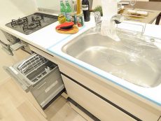 設備はというと、食洗機、グリル、3口コンロ、浄水器一体型シャワー水栓と充実しています。お鍋にお水を入れたり、シンクのお掃除時にはホースを伸ばすと作業が楽にできますよ!