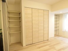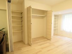 大型のクローゼットを挟んで棚があり、収納スペースもたっぷり。大きな収納家具を用意しなくていい分、居住スペースが有効的に利用できそうです。