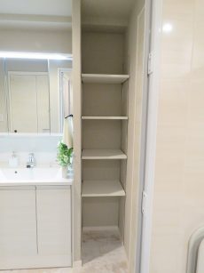 鏡の裏に収納スペースのありますので、ハブラシから洗顔フォームまでゴチャゴチャ散らかりがちな洗面まわりの物もスッキリお仕舞いただけます♪♪洗面台の隣には、リネンの収納に嬉しい可動式の棚も用意されています♪♪