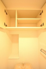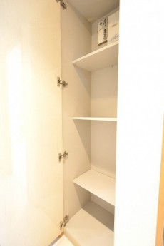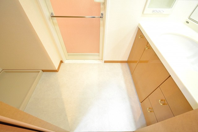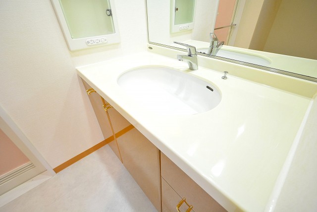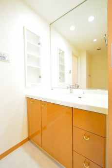 入って右側に一面鏡の洗面台、リネン庫もあり小物の収納に重宝します。