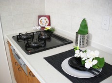 浄水機能付きの水栓はシャワーヘッド、3口のグリル付きガスコンロが付いています。