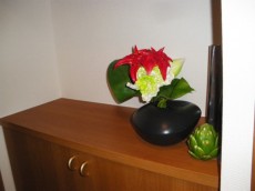 シューズボックスの上のスペースには、インパクトある小物や季節の花をドドンと