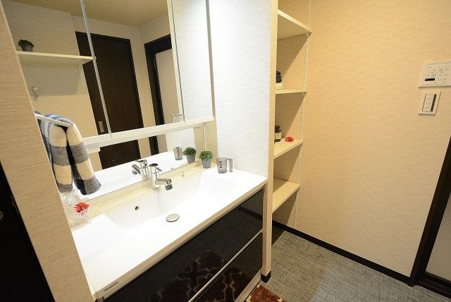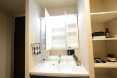 洗面化粧台は、フロントの一枚鏡がまるでホテルのような雰囲気。
