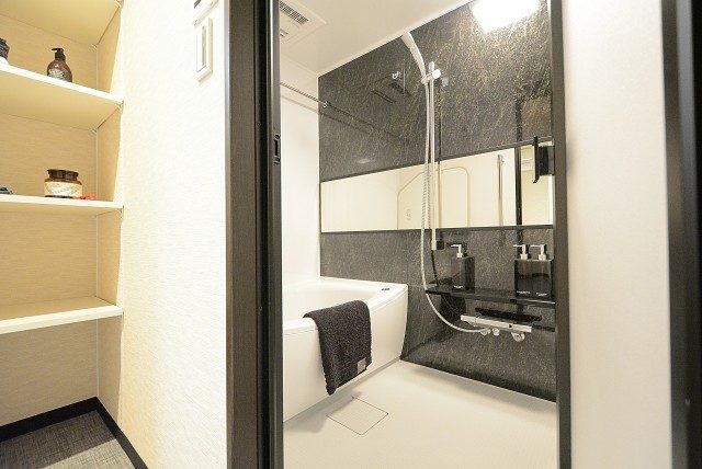 こちらもサイドに棚が設けてあり、バスタオルも問題なく入る奥行きです。