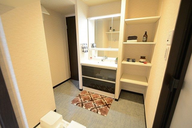 【洗面室:洗面化粧台・浴室・洗濯機スペース・リネン棚】
