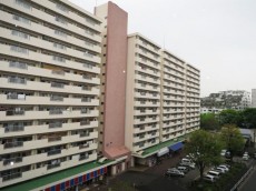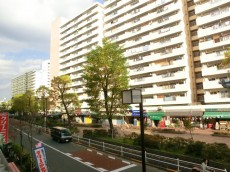 南東向きのバルコニーからは、お向かいの巨大な都営住宅が。道路の幅が