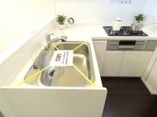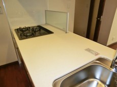 キッチンは人気のカウンタータイプ。開放的で、お料理中でもご家族やご友人との会話が途切れることがありません。LIXIL製のシステムキッチンは白でまとめられお部屋の雰囲気にもピッタリ。人造大理石のトップでお掃除も楽々ですよ♬