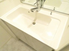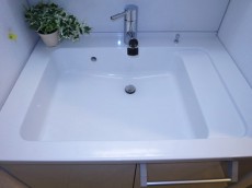 洗面化粧台は継ぎ目のないボウルがお掃除しやすそう。ウェットエリアとドライ