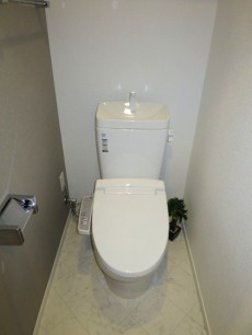 トイレはもちろんウォシュレット付。上部に吊戸棚が設置されていますので、